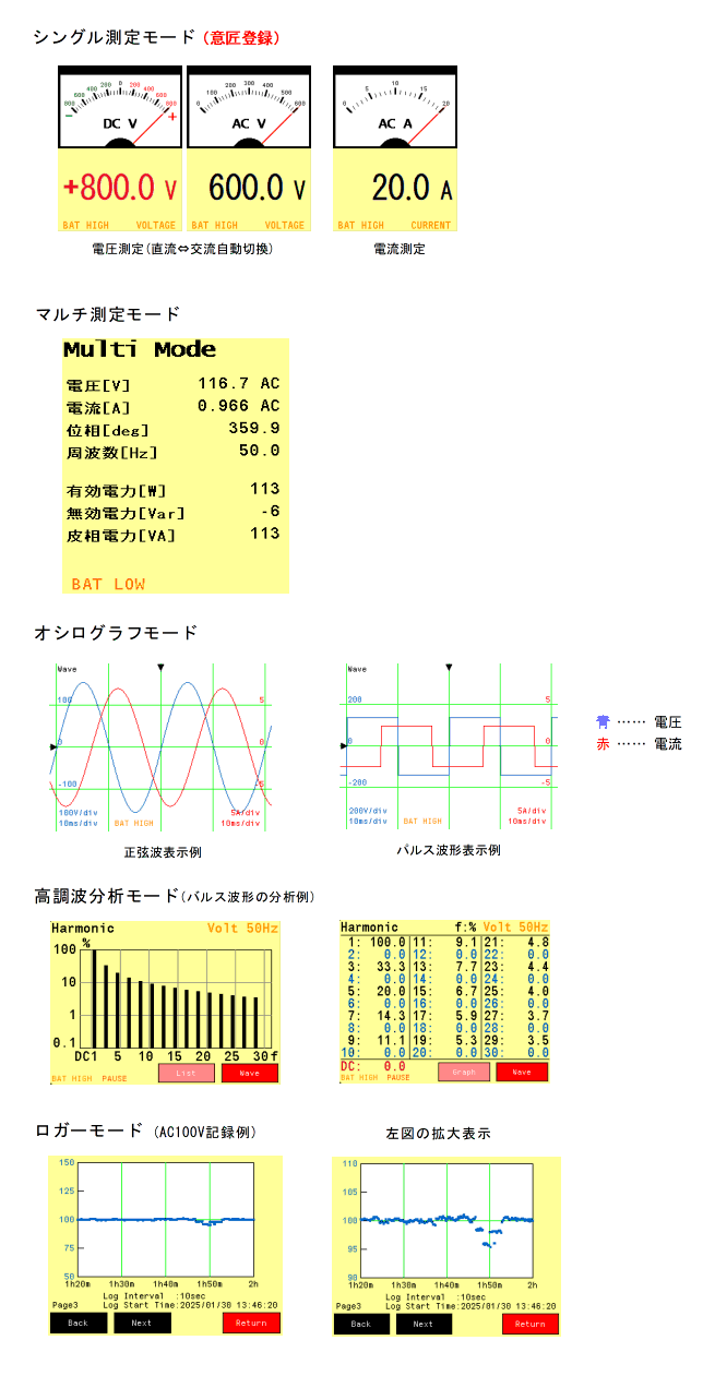 電圧、電流、周波数、位相の測定ができます。また、電力の表示もできます。